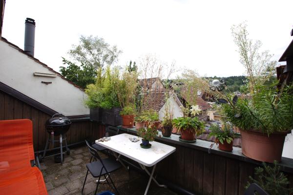 Die Terrasse ist in die Dächer eingebettet und gewährt Aussicht auf den Lindberg.